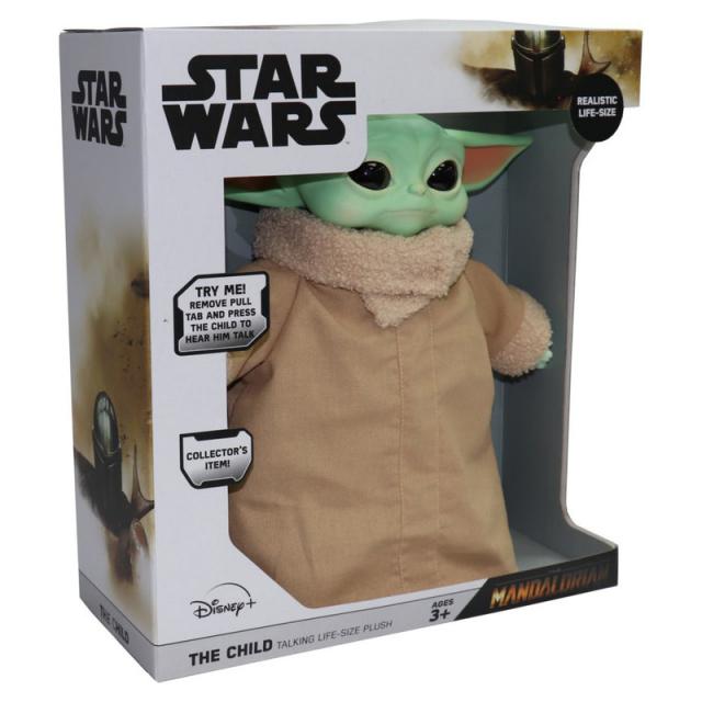 The Star of The Mandalorian – The Child! Bring home this life size version of The Child! Standing at 34cm tall he is the same size as The Child on the show. This Feature Plush includes key sounds from the show and glass eyes. Includes authentic soundsStand 34cm tall approx.Press his hand to hear him talkAges 3+